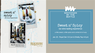 Warm up your winter with a cozy, flavor-filled ice wine tasting featuring three Mackinaw Trail ice wines paired with sweet + spicy bites: